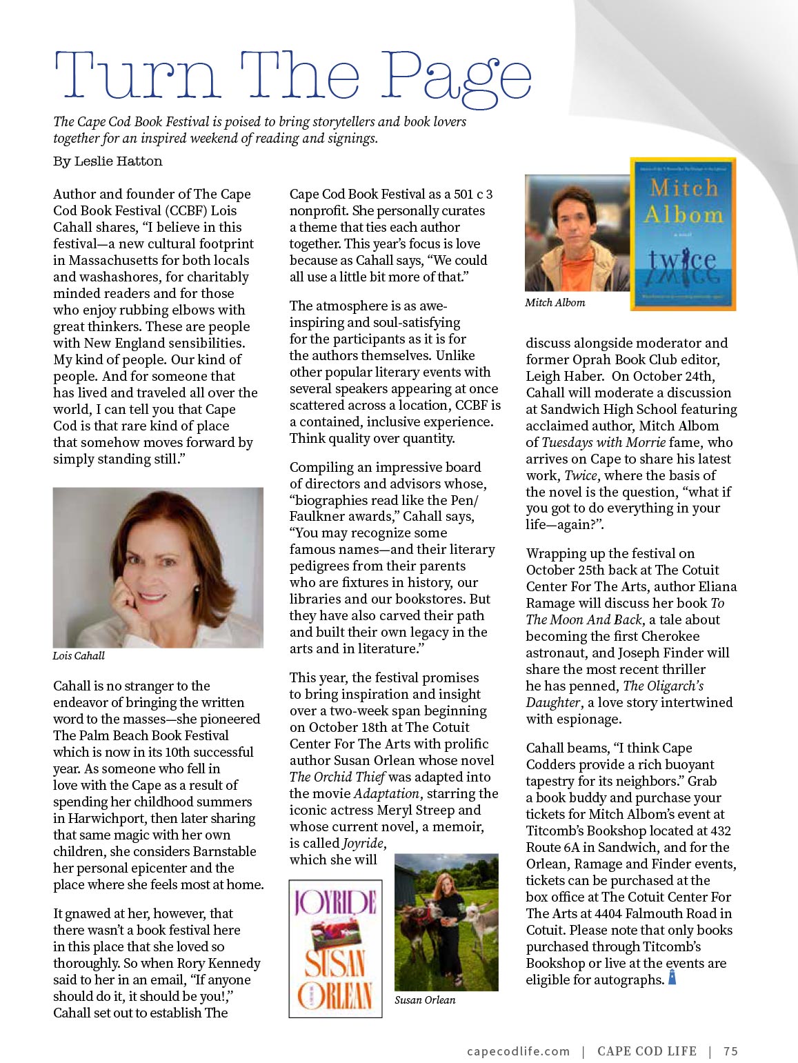 - The inaugural Cape Cod Book Festival, founded by Lois Cahall, will take place November 1-3, 2024.
